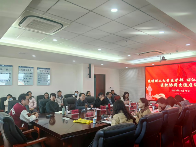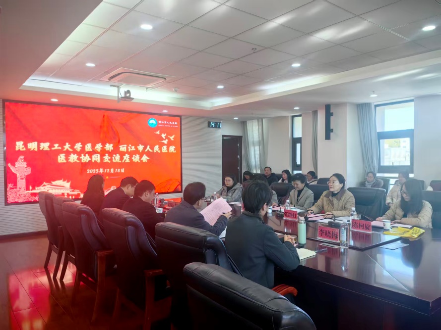 为深入贯彻医教协同与产学研融合发展要求,进一步完善昆明理工大学与非直属附属医院协同育人、协同科研、协同发展的工作机制,12月18日下午,昆明理工大学医学部党工委常务副书记、基础医学院党委书记陈咏梅,基础医学院副院长张继虹一行五人赴丽江市人民医院开展医教研协同工作座谈交流。丽江市人民医院党委副书记、院长陈宗宁,院领导及科研教学部、相关职能部门负责人,硕士生导师及导师后备人才、研究生、住院医师规范化培训学员,以及昆明理工大学毕业医师代表共同参会。