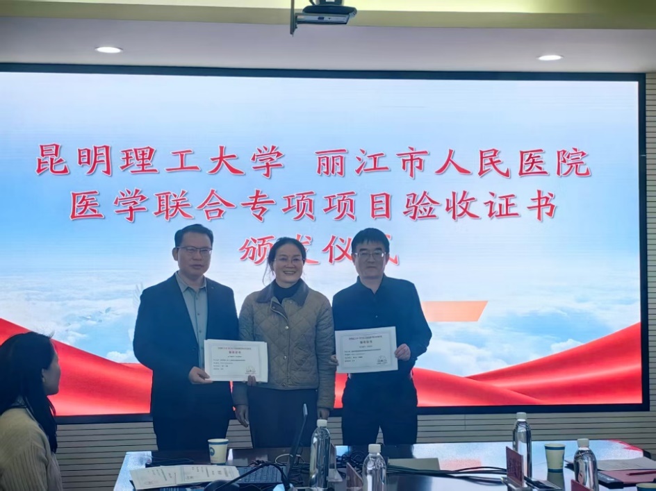 会后,陈咏梅书记和张继虹副院长代表学校向丽江市人民医院医学联合专项项目负责人颁发了结题验收证书。