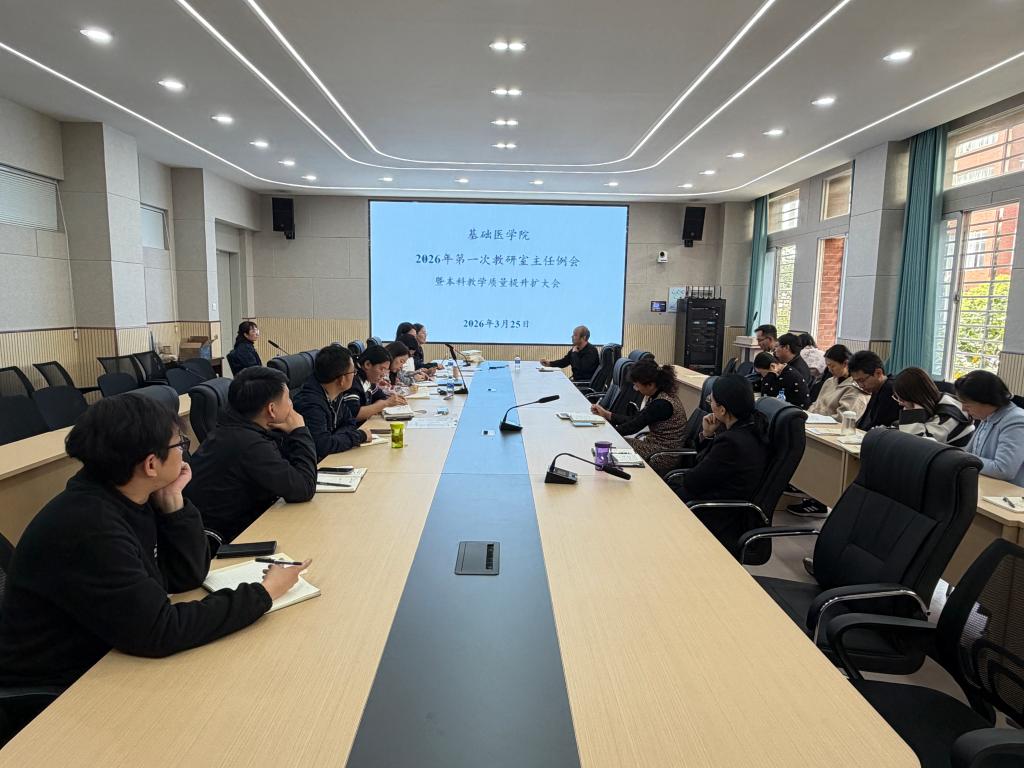 3月25日,基础医学院召开本科教育教学质量提升专题会。本次会议聚焦本科教育教学质量提升、人才培养与就业指导等核心议题,旨在深化教学与学生工作联动,共同筑牢人才培养根基。医学部党工委常务副书记、基础医学院党委书记陈咏梅,医学部党工委委员、基础医学院党委副书记邓玮,医学部相关职能部门、教研室主任、班主任参加此次会议,会议由学院副院长邓仪昊主持。